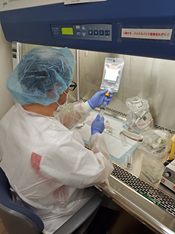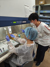 投与前日には、投与量・投与間隔・支持療法(副作用を軽くする治療)の詳細な確認を行っています。投与当日の調製前にも、 検査値や副作用などの最終確認を行い、安全キャビネット(抗がん薬調製専用の環境)での無菌調製を実施しています。